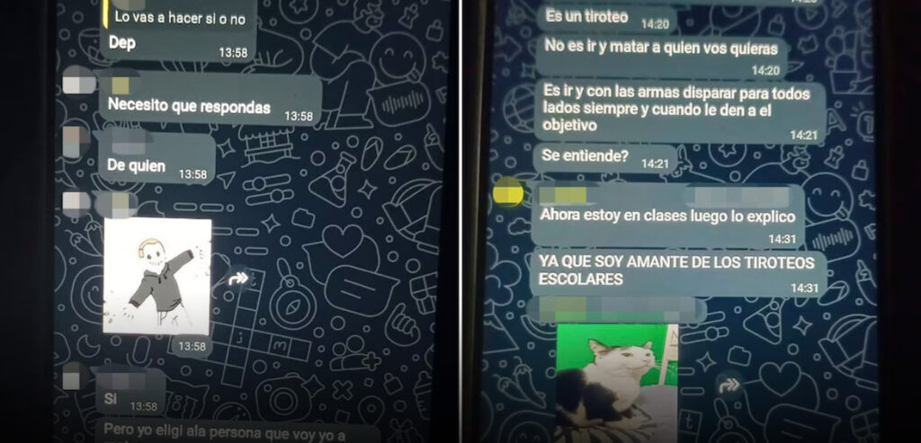 “Lo que vamos a hacer básicamente es un tiroteo escolar, pero la cosa es que yo ya tengo las armas. Mi padrastro tiene”, agregó. “Después de que matemos a los demás hacemos un recorrido por la escuela para ver si quedó alguien con vida”, se podía leer en otro de los mensajes.