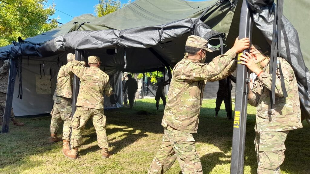 Este viernes al menos 22 integrantes del Ejército Argentino, de la base que se encuentra en Fray Luis Beltrán arribaron a la vecina ciudad de Casilda para montar una carpa de vacunación anti covid 19 en el patio del Hospital San Carlos.
