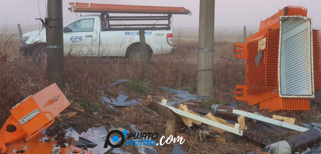 La mañana de este viernes vecinos de Pujato que viven en zona rural dieron cuenta de que no contaban con servicio de suministro eléctrico. Al dar aviso a la Empresa Provincial de la Energía y chequear lo sucedido, se encontraron con el transformador que se ubica detrás del cementerio local destrozado en el suelo.